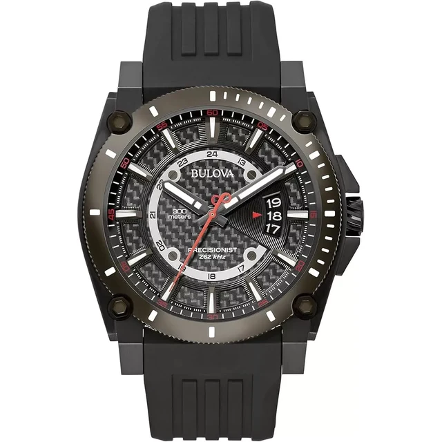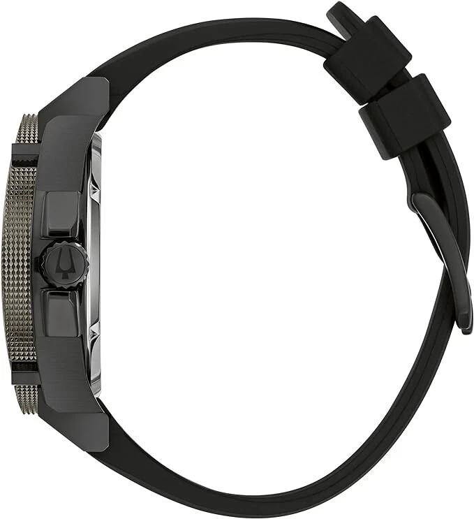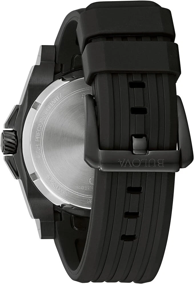 | Reloj Bulova 98B417. Movimiento: características HPQ Precisionist: 3 manos, calendario, HPQ Precisionist. Tamaño de la caja: 46,5 mm. Material de la banda: poliuretano. Resistencia al agua: 30M | |