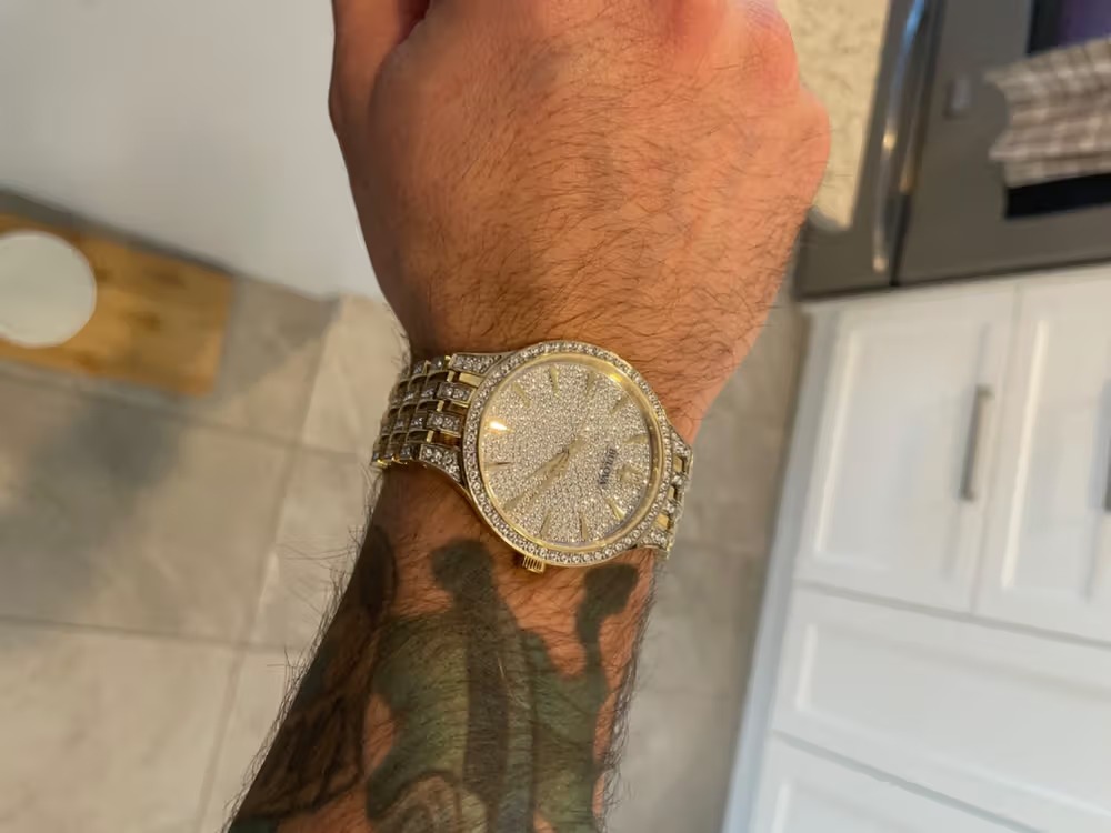 | Phantom Nuevo estilo delgado y elegante adornado con 636 cristales Swarovski®. Caja y pulsera de acero inoxidable en tono dorado y plateado y esfera pavé transparente. El reloj cuenta con un cristal mineral plano, movimiento de cuarzo y resistencia al agua de hasta 30 metros. Diámetro: 40 mm Espesor: 7,1 mm. |