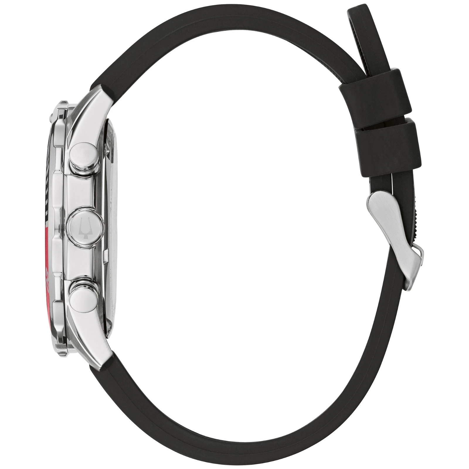 Función de cronógrafo de seis agujas, caja de acero inoxidable con bisel giratorio rojo y negro, esfera negra y correa de silicona negra. El reloj cuenta con un cristal mineral plano, agujas y marcadores luminosos y resistencia al agua de hasta 100 metros.
