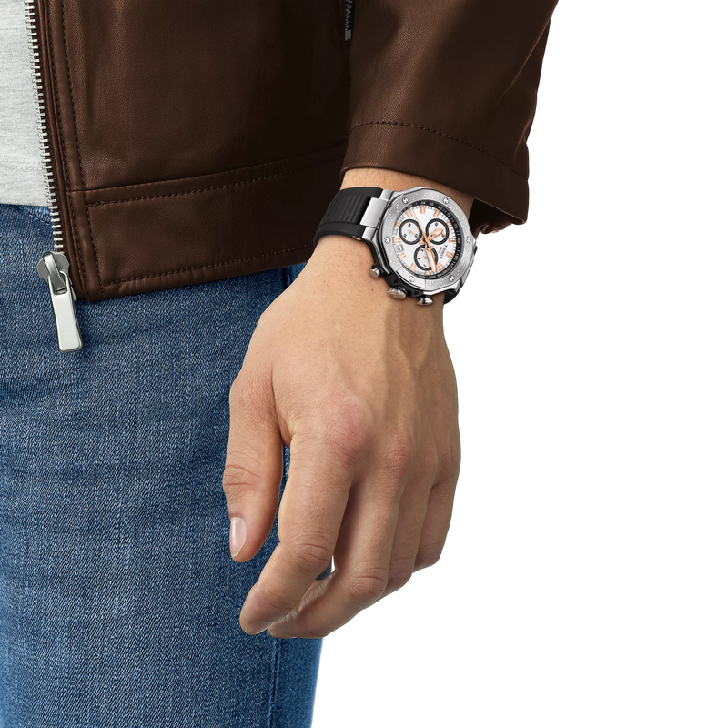 Este año vuelve con un nuevo diseño que ahora presenta una esfera más elegante -dando al reloj un aspecto más puro-, pero respetando sus raíces deportivas. Al igual que el ciclismo, Tissot es el punto de encuentro entre la pasión, la innovación y el estilo. La colección T-Race se inspira en ese estilo de vida y en la libertad, la carretera abierta y la pasión: es el reloj preferido de los caballeros moteros. La familia T-Race mantiene al oyente inmerso en el entorno mecánico y evoca constantemente su espíritu. Por ejemplo, hay un disco de freno y un calibre en el bisel, los pulsadores están inspirados en los manillares y las aletas de refrigeración del motor están representadas en el lateral de la caja. Es resistente al agua, con movimiento cronógrafo de cuarzo y agujas de horas y minutos distintas recubiertas de SuperlumiNova. Tissot se ha inspirado en su colaboración para producir relojes que reflejen la naturaleza dinámica de las propias motos y la emoción de este deporte.