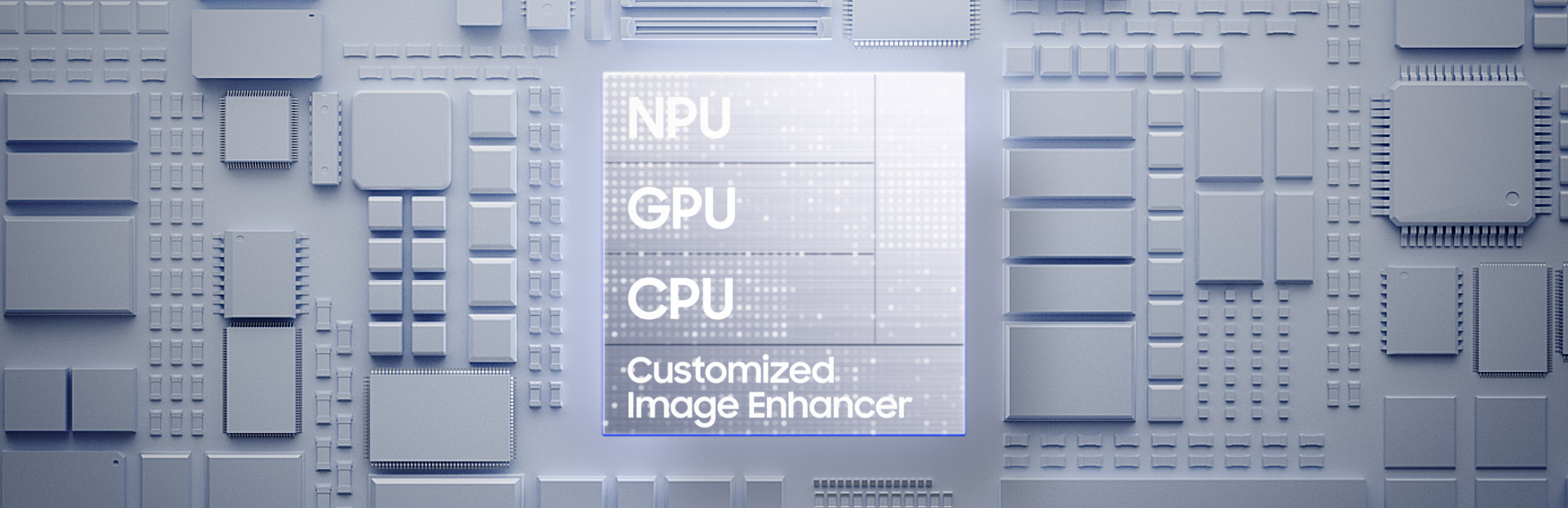 Se ve el chip personalizado del Galaxy S26 plus con NPU, GPU, CPU y un potenciador de imagen personalizado Customized Image Enhancer. A medida que cae, la luz fluye hacia el resto de la placa del chip. Al alejar el zoom, se ve la pantalla principal del Galaxy S26 plus. El chip original se convierte y forma la palabra AI.