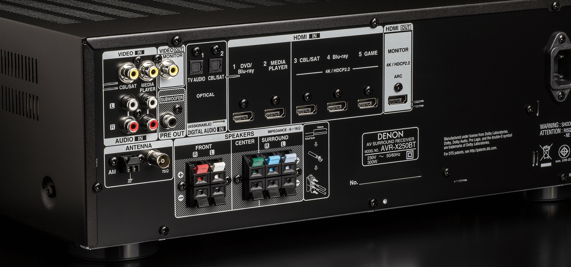 El AVR-X250BT cuenta con una sección HDMI avanzada con cinco entradas que ofrecen resolución 4K Ultra HD, HDR, BT.2020, Wide Color Gamut, submuestreo de color puro 4:4:4, así como transferencia de video 21:9 y 3D y compatibilidad con transferencia HLG (Hybrid Log-Gamma) para lograr un color, una claridad y un contraste excepcionales. Se admite HDCP 2.2 en tres entradas para contenido protegido contra copia.