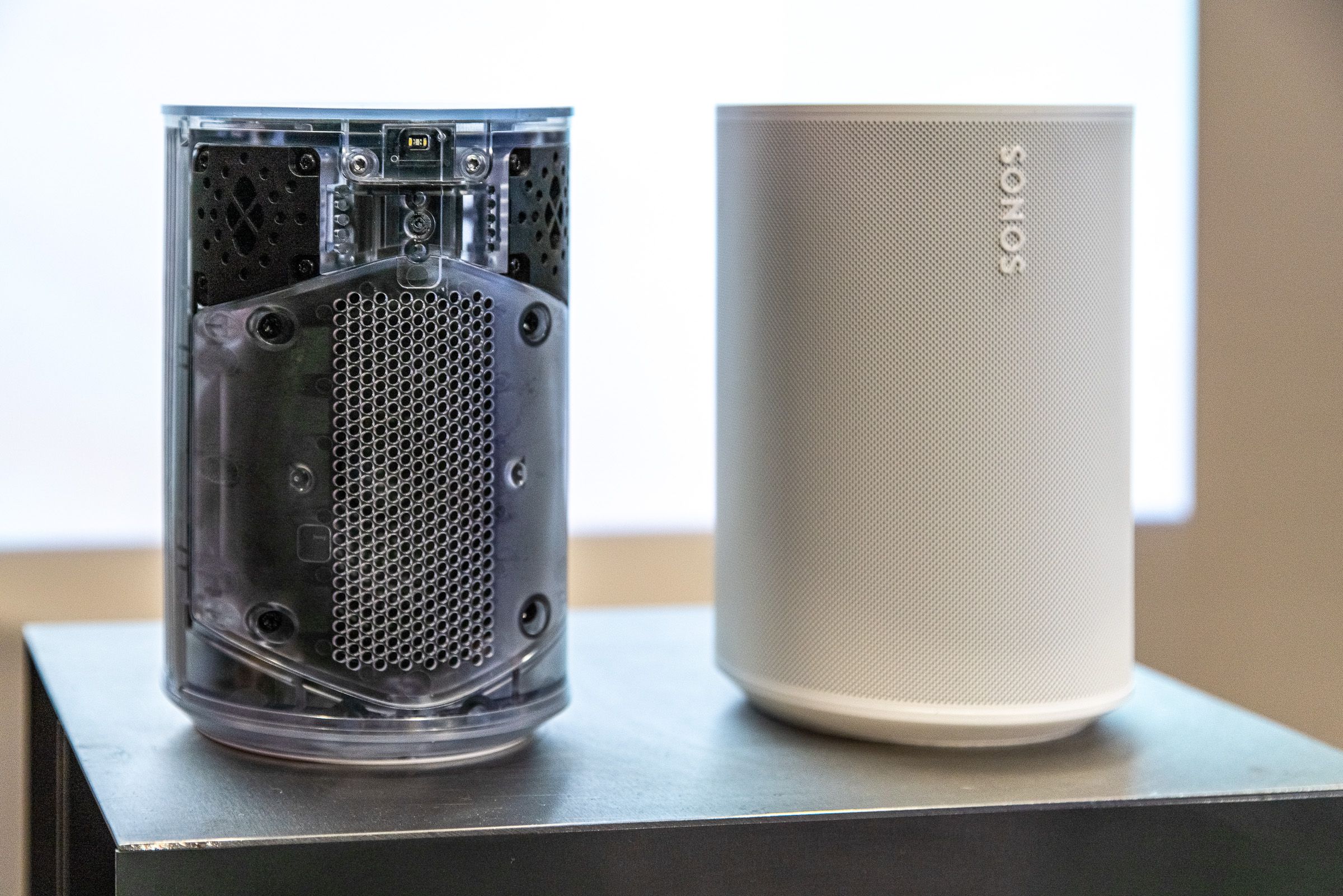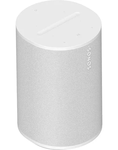 Una Sonos Era 100 en blanco en una repisa oscura