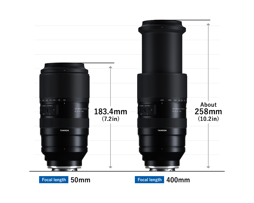 Una de las principales características del 50-400 mm f/4.5-6.3 VC es su amplísimo rango de distancias focales, que abarca desde 50 mm hasta 400 mm, y ofrece un zoom de 8x. Con una distancia focal de 50 mm en el extremo angular, permite capturar el sujeto en primer plano mientras se aprovecha el fondo. Este nuevo objetivo es ideal para diversas situaciones, como paisajes, avistamiento de ballenas, deportes y fotos de grupo. A pesar de su amplio rango de distancias focales, este objetivo es compacto y ligero, con una longitud de tan solo 183,4 mm (7,2 pulgadas) y un peso de 1155 g (40,7 oz). Esto facilita su manejo y lo hace útil en situaciones donde se desea reducir el peso y el espacio.